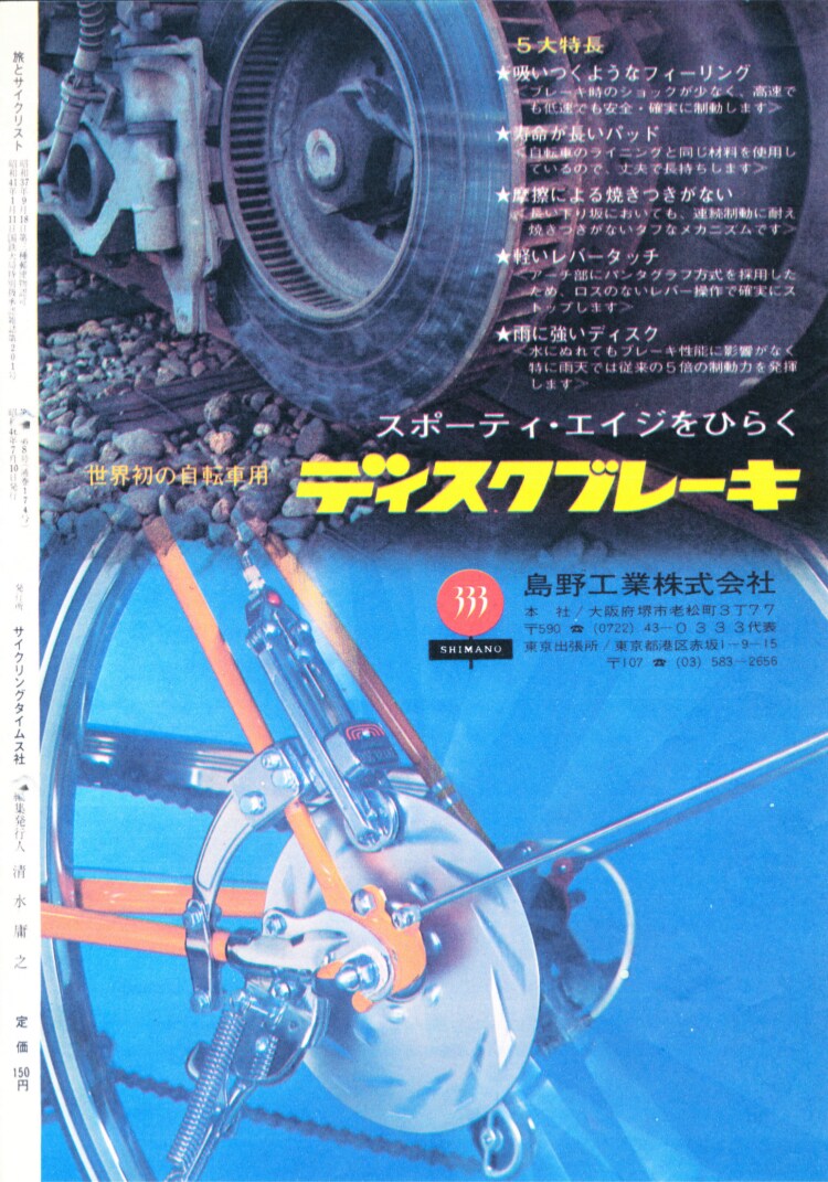 From the latter half of the 1960s to the beginning of the 1980s, in Japan, sports bicycles became the rage among children. Sports bicycles for children at that time, called junior sports bikes, actively incorporated elements of sports cars, which were admired by children. In 1971, Shimano developed a disc brake, which was the standard of sports cars, for junior sports bicycles. It attracted people’s attention as a new brake system for bicycles and enjoyed brisk sales. Although disc brakes showed less braking force decline in the rain and thus delivered stable performance, they failed to become prevalent in full-fledged sports bikes for weight and other reasons. They disappeared from the market for a while as junior sports bicycles fell into a decline. It was in the 1990s when disc brakes drew renewed attention due to their good compatibility with suspensions, which were becoming widespread in mountain bikes. They underwent subsequent improvements, and now are becoming the standard brake type for sports bikes.