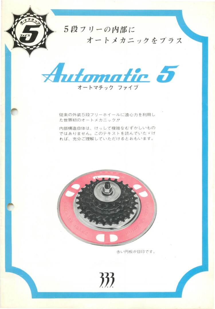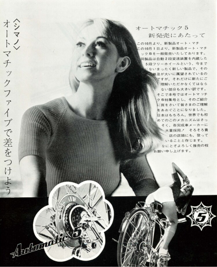 Shimano started the development of automatic shifting mechanisms based on a combination of an internal geared hub and a derailleur, and it released AUTOMATIC 5, which incorporated an automatic 2-speed internal geared hub with an automechanism inside a 5-speed free derailleur, in 1968 and AUTOMATIC II, featuring a further enhanced automatic shifting mechanism in 1969. At that time, automatic mechanism meant an automatic shifting system using centrifugal force, in which when the bicycle slowed down, it switched to a lower gear and when it picked up speed, it switched to a higher gear. Offering the advantage that the rider could start pedaling easily since the bicycle was in a low gear when stopped, which prevented the bicycle from tottering, the automatic gear systems were widely used for sports bikes and small-wheeled bicycles, as well as bicycles for women. However, since there was a major gap between the timing for shifting ideal for riders and the automatic shifting that used centrifugal force, they were not well received by the market.