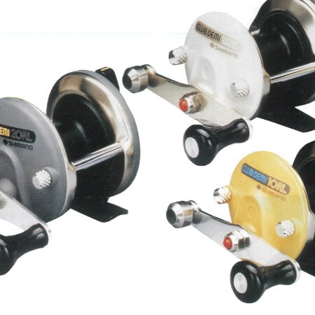 シマノ初の両軸リールとして1973年に「DUX DEMI-13」をリリース。スプールのすき間に巻き糸が噛み込まない独自の機構を搭載し、片手にすっぽりと収まる「超小型」でシンプルなデザインが注目を集め、同年のグッドデザイン賞を受賞。不朽の名作として、その後10年以上にわたるロングセラー製品となりました。1976年には、デザインに高級感が漂う「ゴールドDEMI」を、1985年には、より軽さを追求し、フレーム、スプール素材にカーボンを採用した「カーボDEMI」を、そして1989年にはタナ(水深)を直読できるカウンターを搭載した「TANATORU DEMI」など、新しいデザインや機能を搭載し、次々と新製品を展開しました。同じく1989年に発売した「CLUB DEMI」は、「もっと明るく、もっと楽しい」をコンセプトに、カラフルでモダンなデザインを採用。1992年に発売されたモデルは、今なお愛され、販売を続けています。