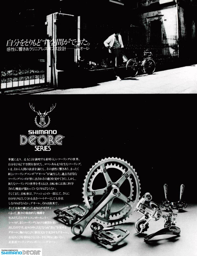 1980年代初頭に、本格ツーリング用コンポーネンツとして登場。DEOREは鹿のdeerからとられたネーミングで、野山を華麗に駆け抜け、走ることを満喫するツーリングの世界をイメージしています。1980年から本格的にマウンテンバイクが拡大していくなかで、「DEORE XT」が派生。1990年代からは、ミドルグレードのマウンテンバイク・コンポーネンツとして展開しています。2000年代にはトレッキングバイクにも広く搭載されました。現在は、ツーリングから本格的なXC(クロスカントリー)レースまで、あらゆるシーンに対応するマウンテンバイク・コンポーネンツとして、上位モデルの機能を踏襲しつつ、その名に込められた思想を受け継ぎ、走る喜びを多くの人に伝えています。シマノのオフロード・ツーリングを支えてきた、歴史あるコンポーネンツです。